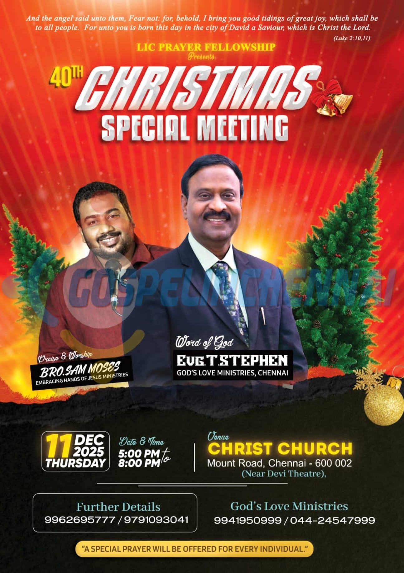 Home EVENTS 40th Christmas Special Meeting 40th Christmas Special Meeting Phone 9962695777+ Add to Google Calendar+ iCal / Outlook export DateDec 11 2025 Thursday Time 5:00 pm - 8:00 pm LocationChrist ChurchMount Road, opp. HEAD POST OFFICE, Border Thottam, Padupakkam, Triplicane, ChennaiShare this event Weather Mist 78 °F °MetricWind: 11 MPHHumidity: 83 %Feels like: 81 °F X
