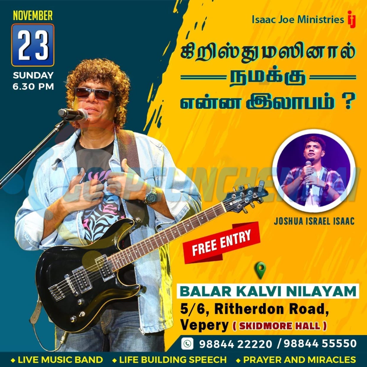 Home EVENTS Benefit of Christmas Benefit of Christmas Phone 9884422220The event is finished. DateNov 23 2025 SundayExpired! Time 6:30 pm LabelsNEW LocationBKN Auditorium,Ritherdon Road, Periamet, Vepery, Chennai, Tamil Nadu, IndiaShare this event Weather Mist 83 °F °MetricWind: 11 MPHHumidity: 89 %Feels like: 92 °F X