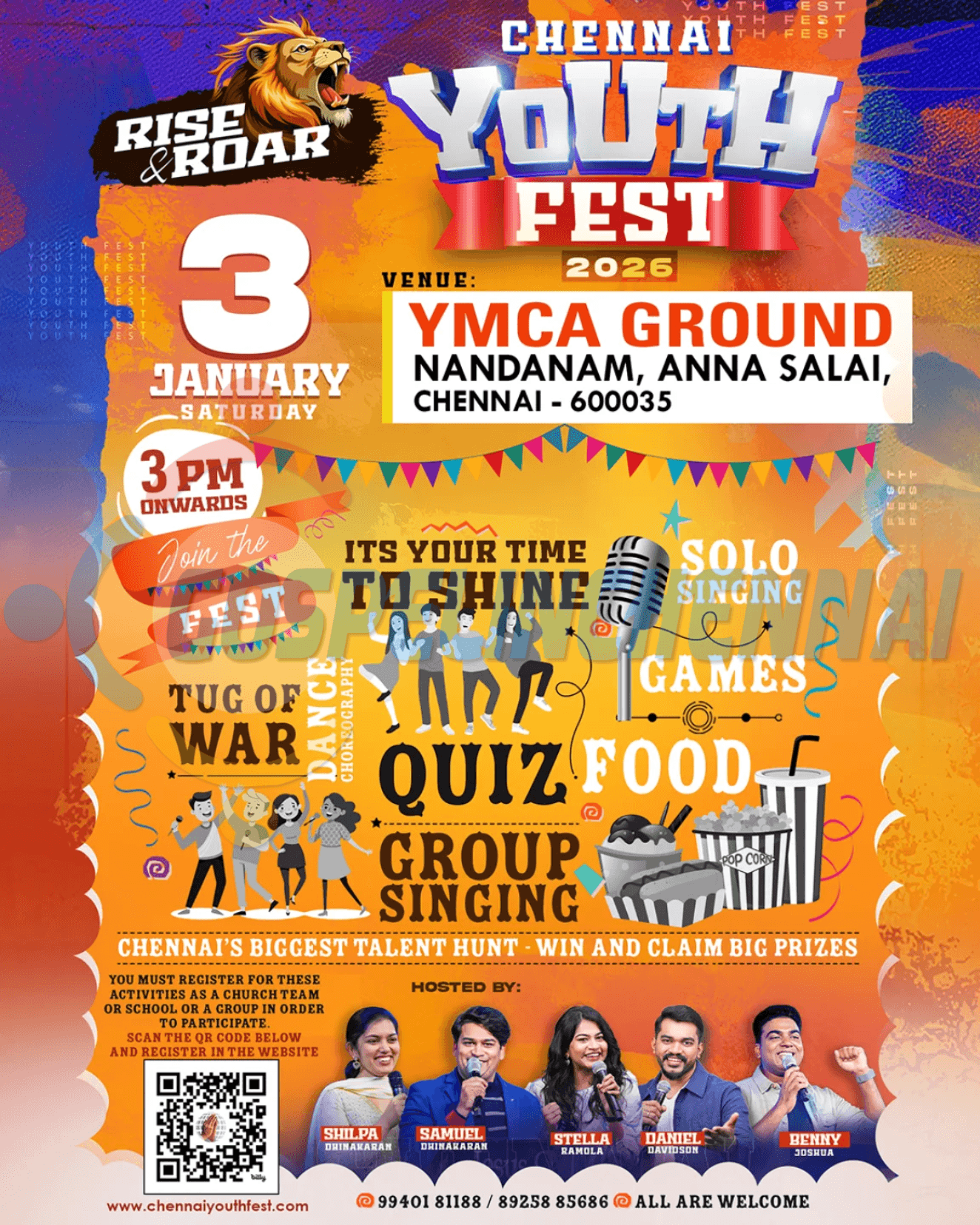 Young Champions! it’s time to RISE & ROAR! Get ready for a massive youth explosion at the CHENNAI YOUTH FEST 2026 on Saturday, 3rd January 2026 from 3 PM onwards at YMCA Ground, Nandanam, Chennai, the biggest talent hunt the city has ever seen!