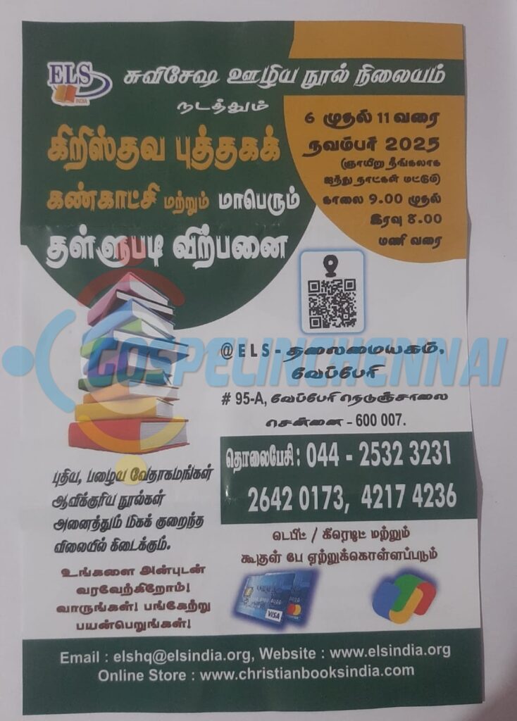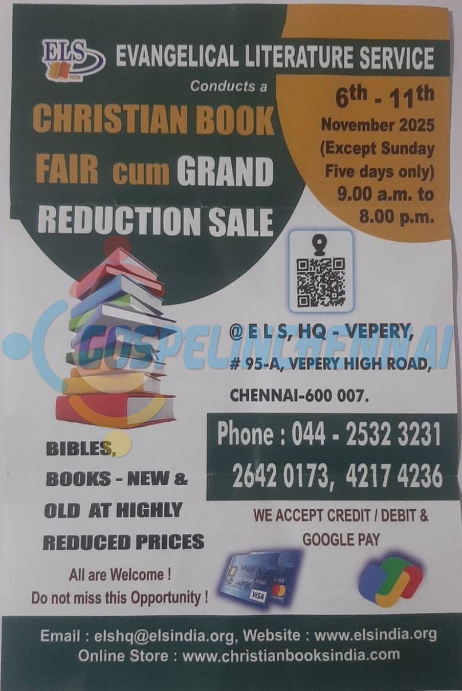 Home EVENTS Christian Book Fair Christian Book Fair Phone 04425323231+ Add to Google Calendar+ iCal / Outlook export DateNov 07 2025 Friday Time 9:00 am - 8:00 pm LabelsNEW,Recurring Event LocationEvangelical Literature Service (ELS)Vepery High Road, Periamet, Vepery, Park Town, ChennaiNext Occurrences Nov 08 2025 9:00 am - 8:00 pm Nov 10 2025 9:00 am - 8:00 pm Nov 11 2025 9:00 am - 8:00 pm Share this event Weather Mist 85 °F °MetricWind: 9 MPHHumidity: 84 %Feels like: 97 °F X