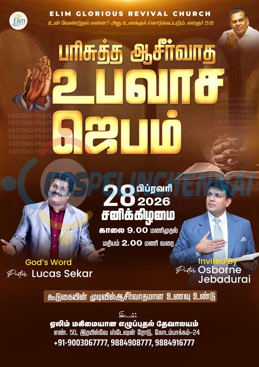 Home EVENTS Fasting Prayer Fasting Prayer Phone 9003067777+ Add to Google Calendar+ iCal / Outlook export DateFeb 28 2026 Saturday Time 9:00 am - 2:00 pm LabelsNEW LocationElim Glorious Revival ChurchRailway Border Road, Taylor Estate, Kodambakkam, ChennaiShare this event Weather Mist 83 °F °MetricWind: 15 MPHHumidity: 79 %Feels like: 90 °F X