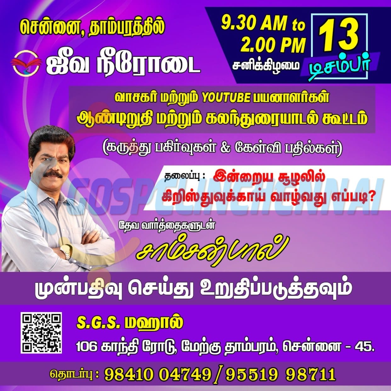 Home EVENTS How to live for Christ in this age? How to live for Christ in this age? Phone 9841004749+ Add to Google Calendar+ iCal / Outlook export DateDec 13 2025 Saturday Time 9:30 am - 2:00 pm LabelsNEW LocationSGS MahalGandhi Road, West Tambaram, Tambaram, ChennaiShare this event Weather Mist 78 °F °MetricWind: 9 MPHHumidity: 83 %Feels like: 81 °F X