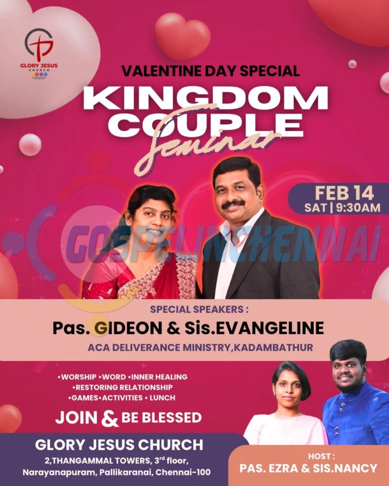 Home EVENTS Kingdom Couple Seminar Kingdom Couple Seminar+ Add to Google Calendar+ iCal / Outlook export DateFeb 14 2026 Saturday Time 9:30 am LabelsNEW LocationGlory Jesus ChurchVelachery - Tambaram Main Road, Narayanapuram, Pallikaranai, ChennaiShare this event Weather Partly cloudy 85 °F °MetricWind: 12 MPHHumidity: 70 %Feels like: 89 °F X