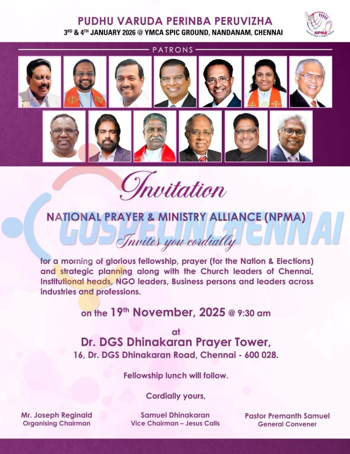 We lovingly invite you for the Pastors and Leaders meeting on 19th November 2025, 9:30am at Dr DGS Dhinakaran Prayer Tower, Dr DGS Dhinakaran Road, Chennai.