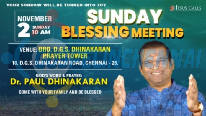 Home EVENTS Sunday Blessing Meeting Sunday Blessing Meeting+ Add to Google Calendar+ iCal / Outlook export DateNov 02 2025 Sunday Time 10:00 am LocationJesus Calls Prayer TowerDoctor DGS Dhinakaran Salai, State Bank of India Colony, Raja Annamalai Puram, ChennaiShare this event Weather Mist 85 °F °MetricWind: 10 MPHHumidity: 84 %Feels like: 95 °F X