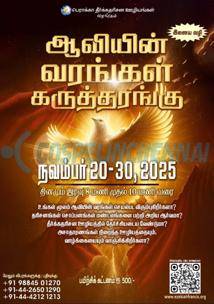 Home EVENTS Unveiling the Gifts of the Holy Spirit Unveiling the Gifts of the Holy Spirit Phone 9884501270+ Add to Google Calendar+ iCal / Outlook export DateNov 20 2025 Thursday Time 8:00 pm - 10:00 pm Cost₹500 LabelsNEW,Recurring Event LocationOnlineNext Occurrences Nov 21 2025 8:00 pm - 10:00 pm Nov 22 2025 8:00 pm - 10:00 pm Nov 23 2025 8:00 pm - 10:00 pm Nov 24 2025 8:00 pm - 10:00 pm Nov 25 2025 8:00 pm - 10:00 pm Share this event