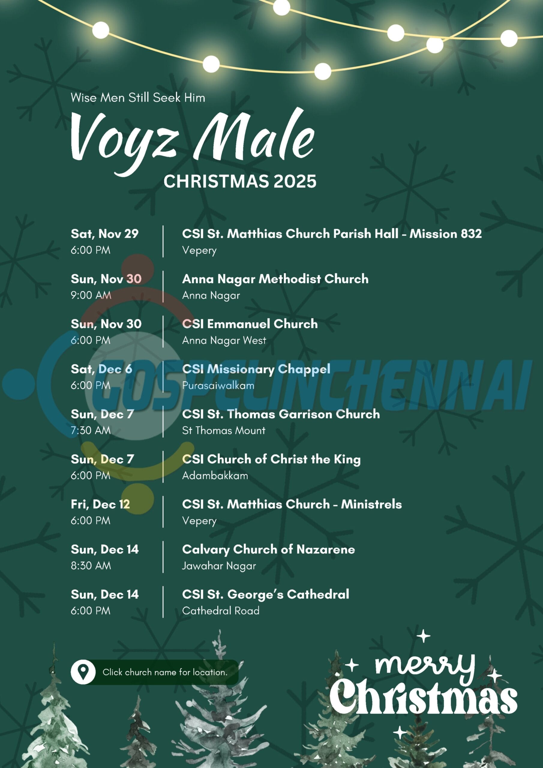 Home EVENTS VoyzMale Christmas 2025 VoyzMale Christmas 2025The event is finished. DateDec 07 2025 SundayExpired! Time 6:00 pm LocationCSI Church of Christ The King - AdambakkamChennai (CSI CCK), 2nd Main Road, Brindavan Nagar Extension, Mohanpuri, Adambakkam, ChennaiShare this event Weather Mist 78 °F °MetricWind: 10 MPHHumidity: 83 %Feels like: 81 °F X