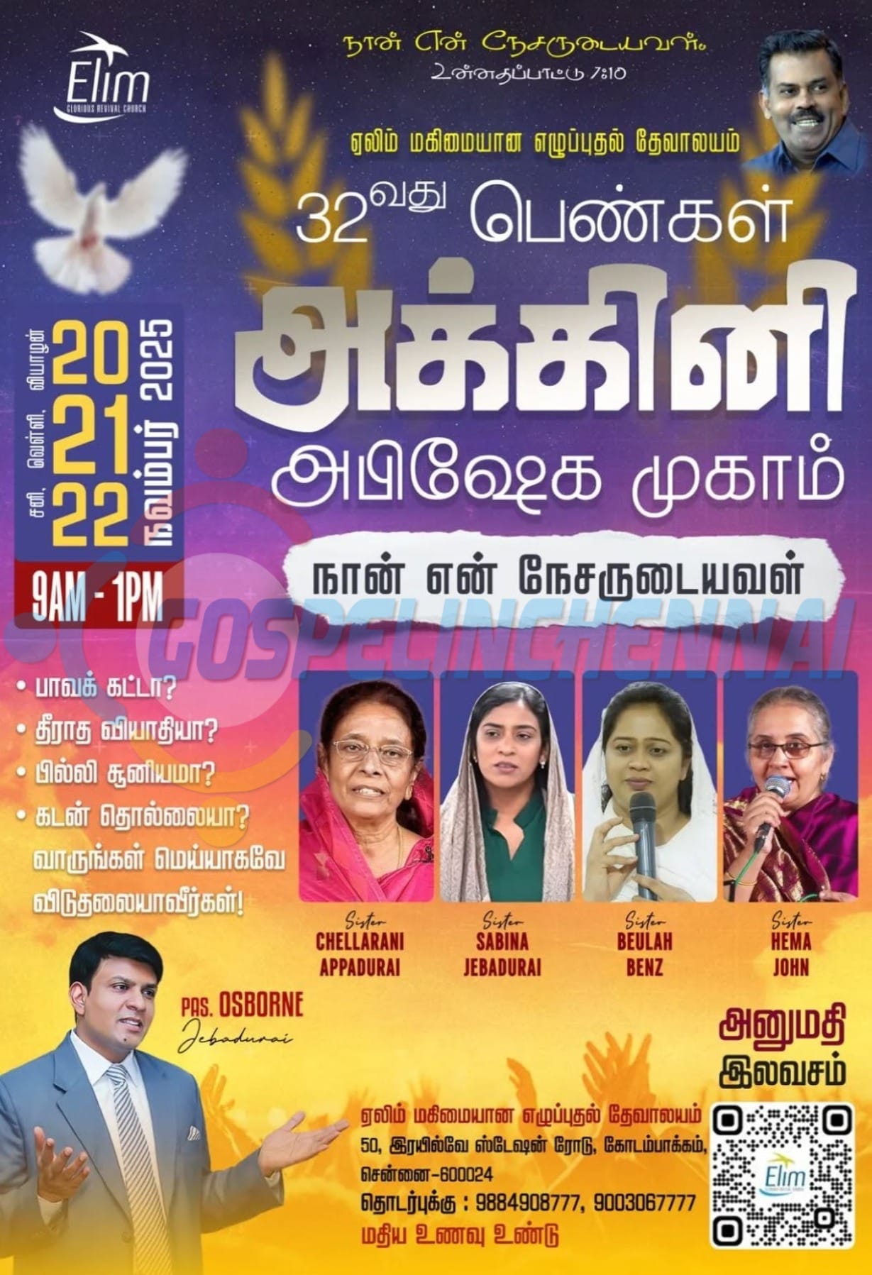 Home EVENTS Women Fire Anointing Camp Women Fire Anointing Camp DateNov 22 2025 SaturdayExpired! Time 9:00 am - 1:00 pm LabelsRecurring Event LocationElim Glorious Revival ChurchRailway Border Road, Taylor Estate, Kodambakkam, ChennaiShare this event Weather Mist 81 °F °MetricWind: 11 MPHHumidity: 89 %Feels like: 88 °F X